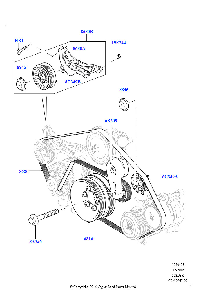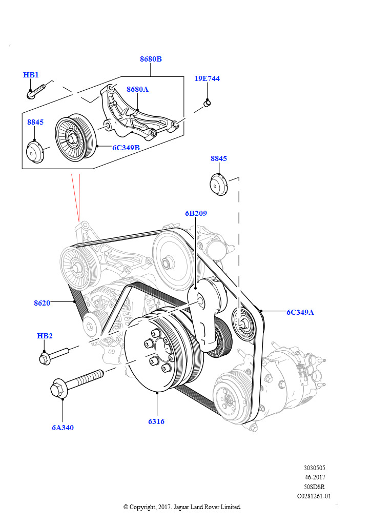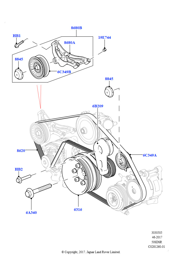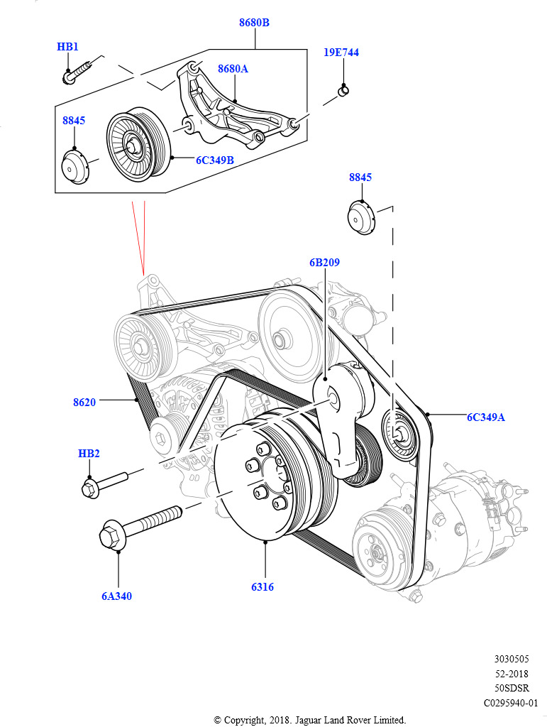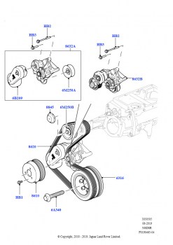 Шкивы и приводные ремни (Первичный привод, 5.0 бензиновый AJ133 DOHC CDA, Пневматическая подвеска с электронной системой управления и системой ACE, 5.0L P AJ133 DOHC CDA S/C Enhanc